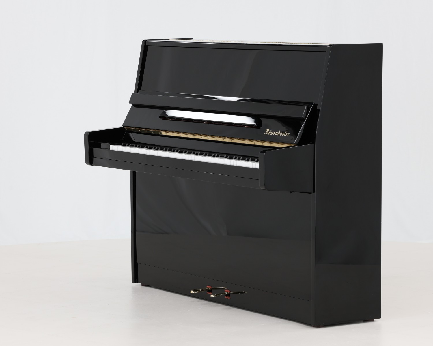 The piano has been fully prepared in our workshops by our Bösendorfer-trained technicians, including the casework, which has been carefully burnished in our workshops and aesthetically looks very close to new. Acoustically, the piano offers a powerful and characterful sound. The bass is strong and resonant, while the upper registers have a clear, bell-like quality that is both expressive and refined. There is a distinctive tonal character that sets Bösendorfer apart from other makers. The piano also features a split top lid with a prop, allowing the sound to be projected more openly in a similar manner to a grand piano.