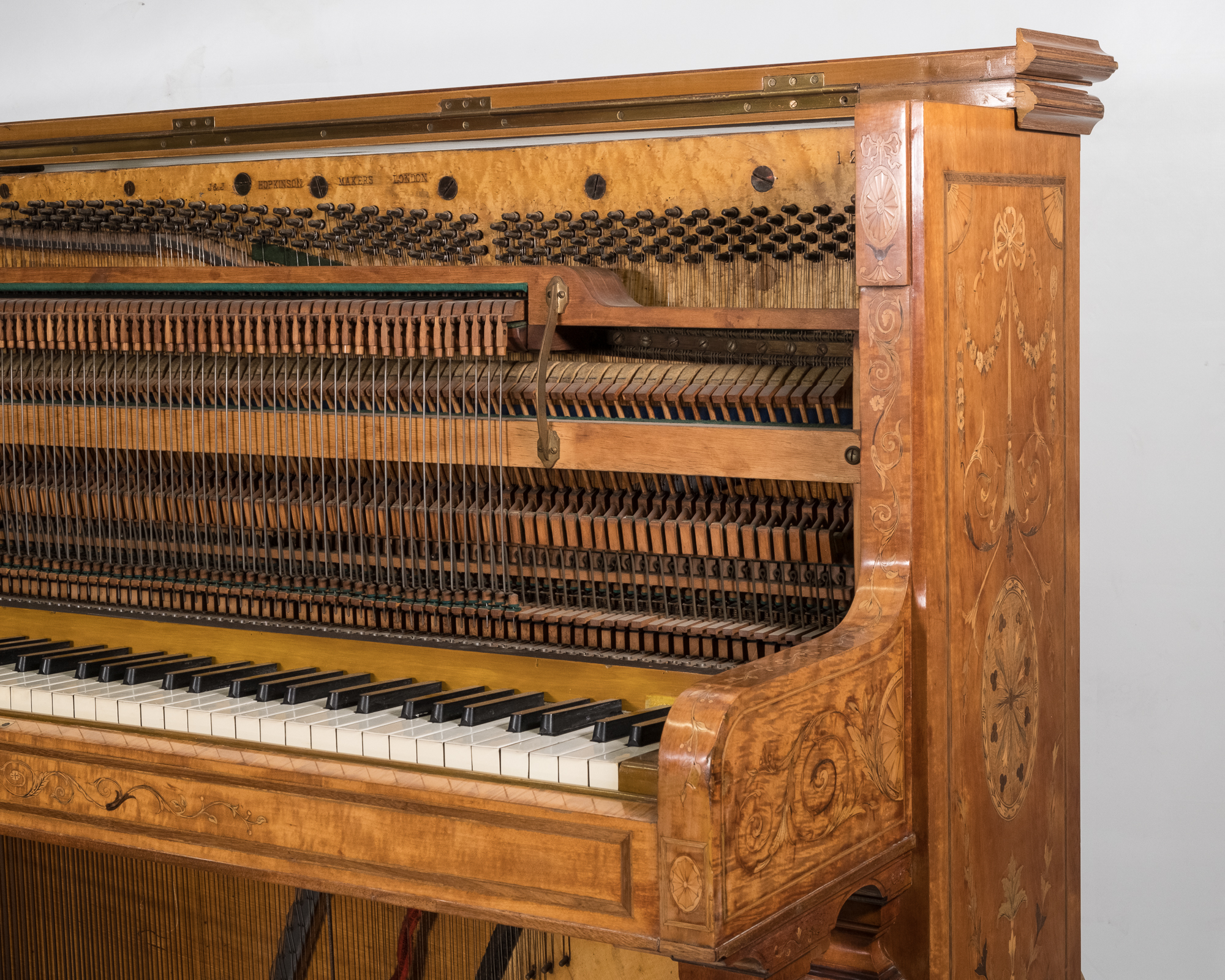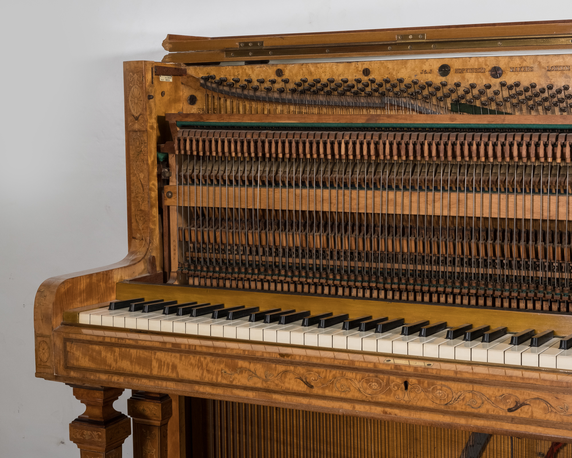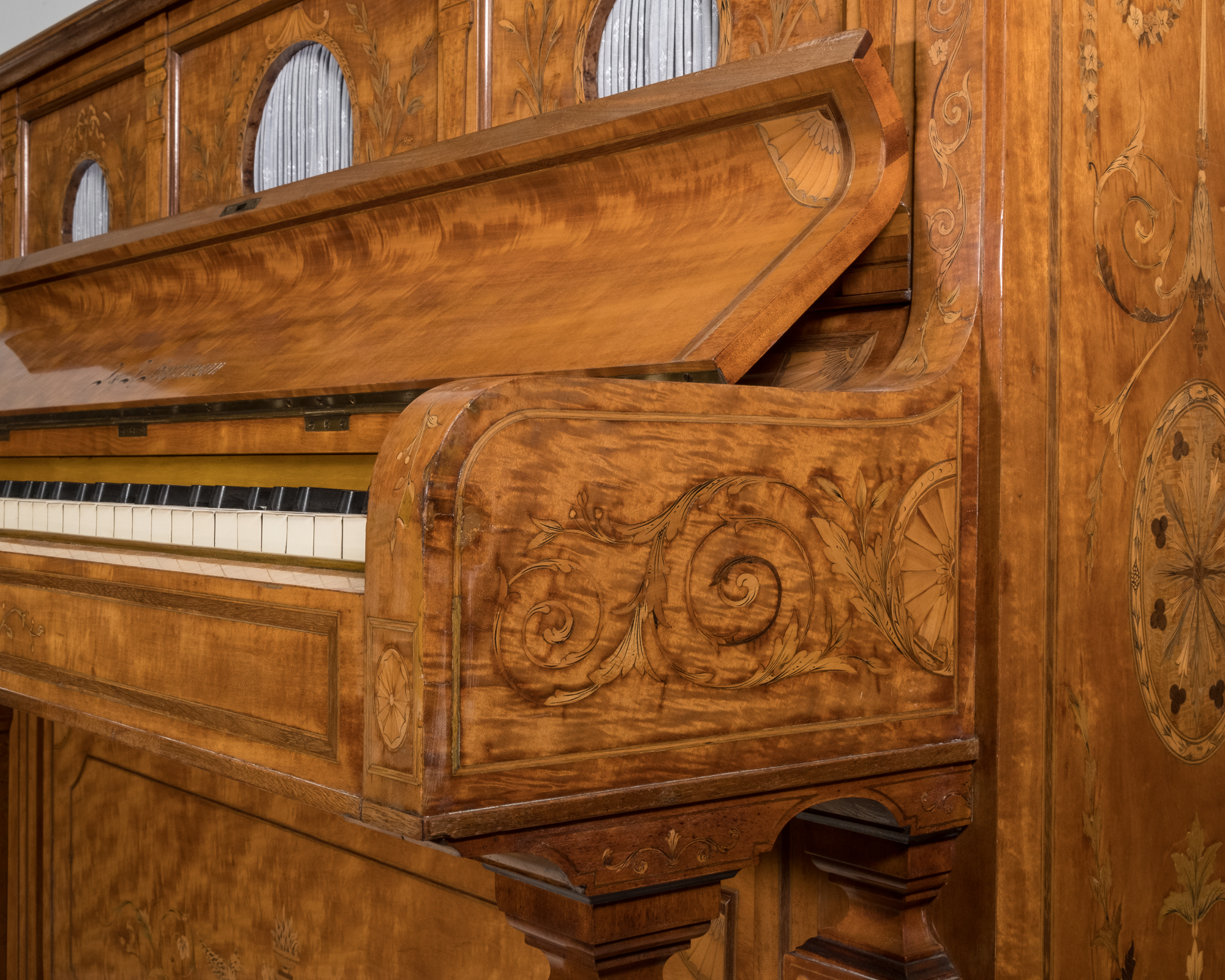 Very special looking period instrument in a stunning satinwood veneered cabinet with beautiful delicate inlays covering the entire piano. This antique instrument is very compact with lovely proportions and ideally suited for smaller period properties. The piano has pretty much retained all its original parts and materials and has been sympathetically overhauled.