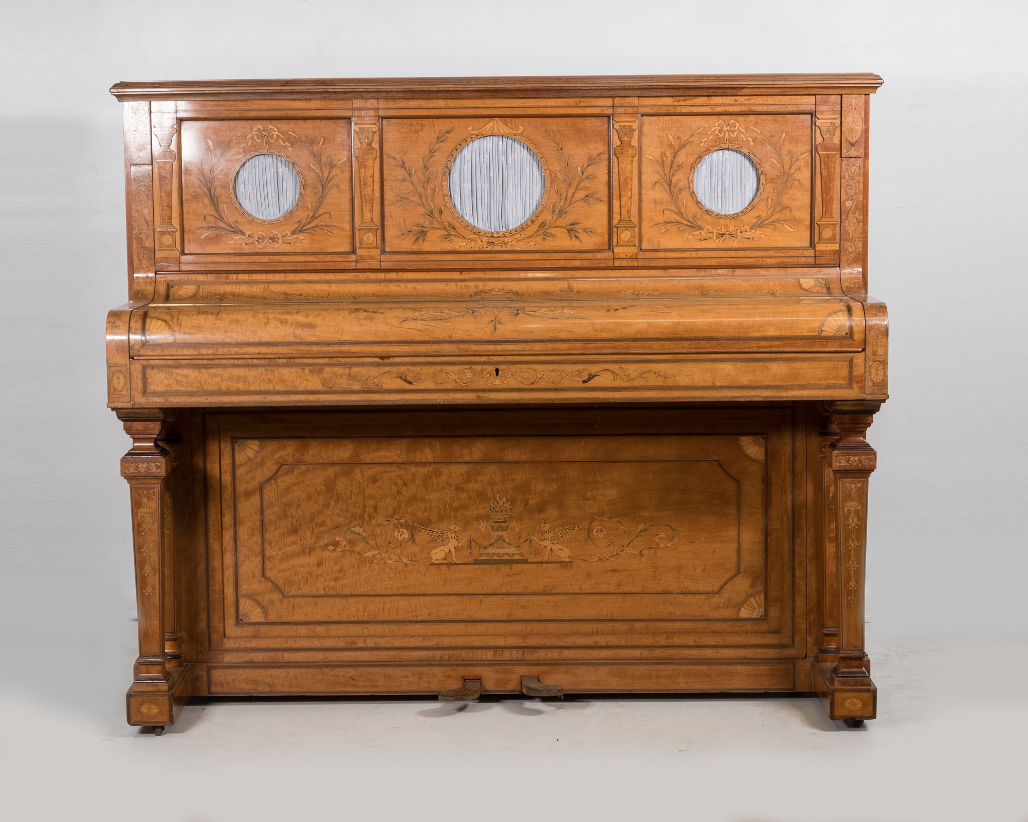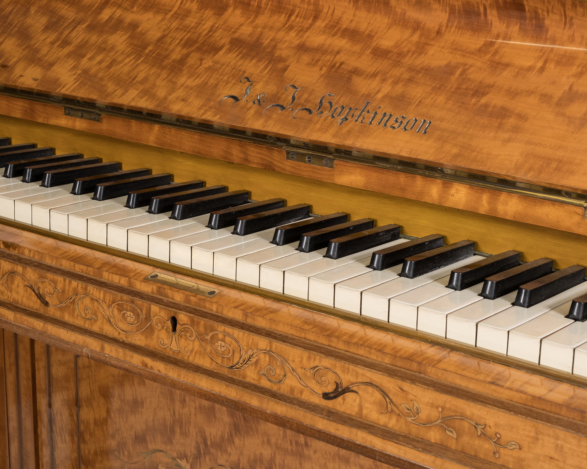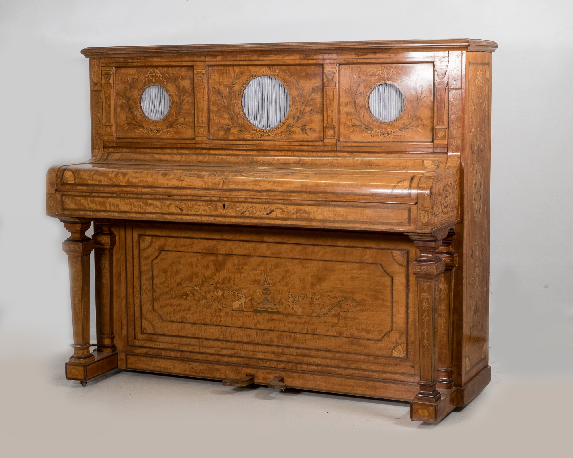Very special looking period instrument in a stunning satinwood veneered cabinet with beautiful delicate inlays covering the entire piano. This antique instrument is very compact with lovely proportions and ideally suited for smaller period properties. The piano has pretty much retained all its original parts and materials and has been sympathetically overhauled.