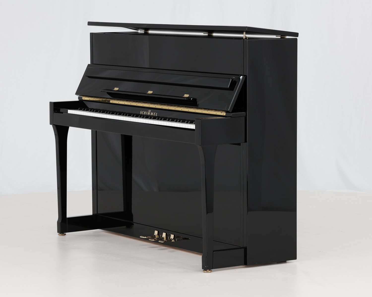 This Schimmel 115 upright piano is a compact, traditionally styled instrument from a respected German piano maker. It offers a practical size for the home while retaining strong musical capability. The piano features beautifully detailed aesthetics throughout. Subtle design elements give it a distinctive character, including shaping at the lower front legs. These legs feature circular brass feet, adding a refined and elegant touch. The pedals follow a similarly refined design.