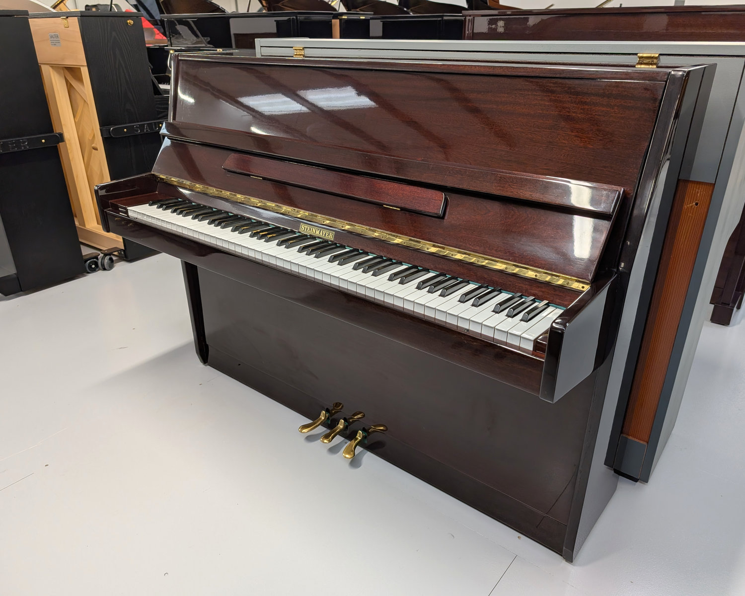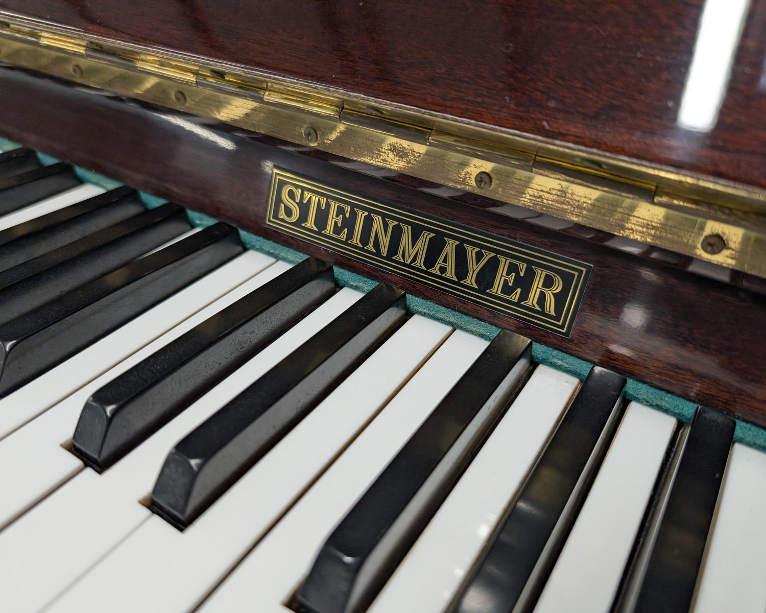 This Steinmayer upright piano is a compact, modern-style instrument offering excellent practicality and impressive musical performance in a small footprint. Finished in a dark polished mahogany, the cabinet presents beautifully with no fading, maintaining a rich, contemporary appearance suited to a wide range of interiors.