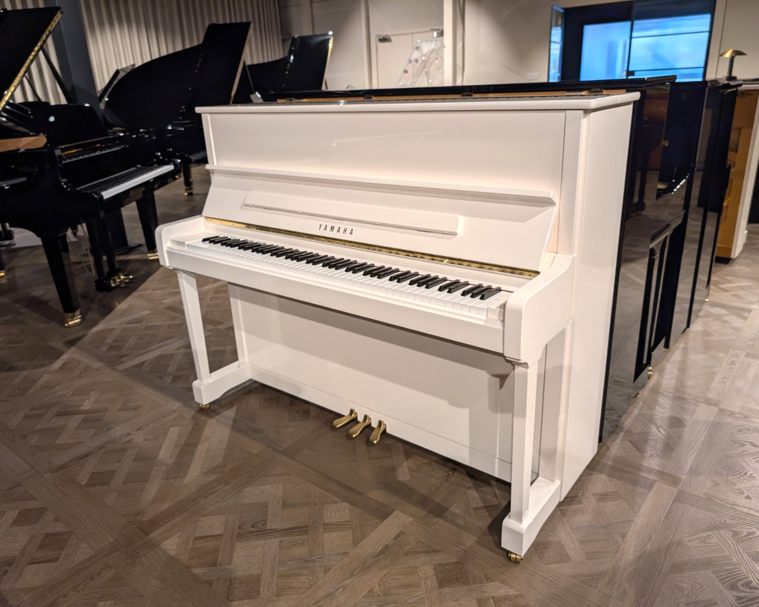 The Yamaha P121 is a superb professional-height upright piano, offering the trusted quality, clarity, and responsiveness for which Yamaha is renowned. This particular example is presented in the highly sought-after polished white finish – a modern, elegant look that is increasingly difficult to source and exceptionally popular in contemporary homes.